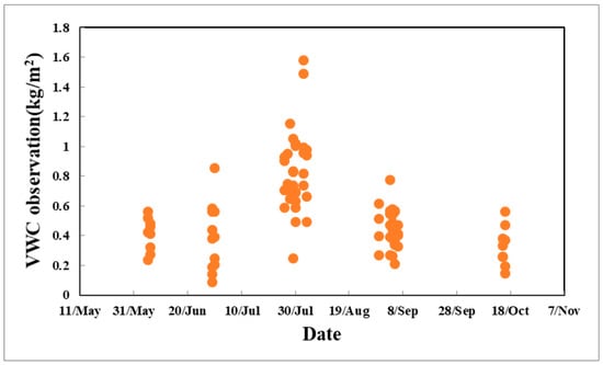 Variation of observed vegetation water content (VWC) during the experimental period.