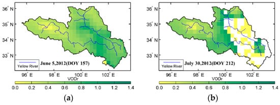 To determine whether the VOD model is beneficial for analyzing waterbodies, Figure 6 and Figure 7 present the spatial distribution of VOD in the source region of the Yellow River in summer, including the results with and without the influence of waterbodies. VODr represents the VOD without the influence of waterbodies, namely, the reference VOD, and VODe represents the VOD considering the influence of waterbodies. Unlike VWC or soil moisture, VOD can not be observed or verified directly by field work. As shown in the Figure 6 and Figure 7, the results from both methods exhibit obvious seasonal changes. High-value distributions occurred along the Yellow River, where they varied in the range of 0.60 to 1.00 and generally exhibited a pattern of low in the west and high in the east. Over some part of the area, compared with these two figures, VOD without considering the contribution of waterbodies cannot obtain any results in Figure 7b–d. This demonstrates that during the period from July to September, the results from the previous method are poor in some part of the region, while the algorithm with considering waterbodies gives better results. This also means the VOD method without considering the influence of waterbodies is invalid and failed in some area at least in this study.