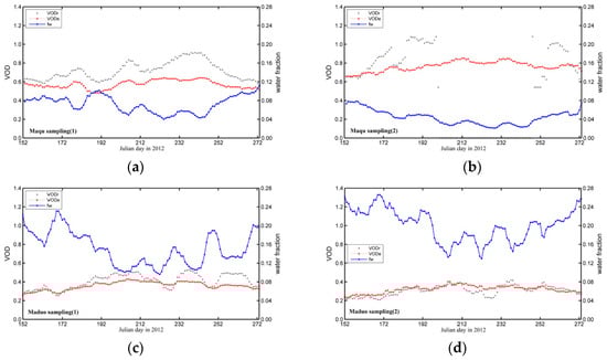 To analyze the seasonal variation trend of VOD, two representative regions are selected in the study area: One is the Maqu area representing the southern part and the other is the Maduo area representing the northwest part. The fresh vegetation bag labeled with the vegetation type, sampling time must be immediately returned to the laboratory and both the sites have the laboratories for measuring and drying fresh vegetation. In each representative area, two representative sampling sites separated by 30 km are selected. Figure 8 shows the temporal distribution of the VOD at four selected sampling sites. The VODr (gray trend line) and VODe (dot-dashed red line) represent the variation trends of the algorithm with and without the influence of waterbodies, respectively. The blue line represents the temporal variation trend of water-body coverage. In the Maqu area or the Maduo area of Sister Lake, the VOD variation with including the influence of waterbodies is small and stable, indicating less interference from the waterbodies. In the Maqu area, during a period from early-June to late-September, the VOD change with considering waterbodies is smaller than that without considering waterbodies, so the former is stable. The maximum VOD appears in early-August, and is approximately 0.60. Because of high elevation of the Maduo area, the temperature and the vegetation density of the meadow are low, VOD is small, and the maximum VOD does not exceed 0.40. Moreover, the variation in the Maduo area is less obvious than that in the Maqu area. The seasonal trend of water-body coverage is consistent in the same region. In the source region, because the water coverage in Sister Lake is abundant, the water-body coverage shows higher than that in the Maqu area. In addition, the algorithm fails obtaining VOD at one site of Maqu without considering the influence of waterbodies.