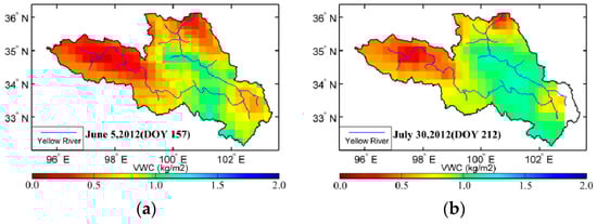 Since the iterative solution of the VOD directly retrieved based on the τ-ω model cannot be obtained in certain regions, we retrieve spatial distribution of the VWC in the source region with including the impact of waterbodies, as shown from Figure 11. The VWC in the entire source region indicates a variation in the range of 0.20 to 1.20kg/m2, and the high VWC appears along the Yellow River and in the southeastern part where the Aba-Tibetan Autonomous Prefecture located. The VWC exhibits less seasonal variation in the western source region, especially in the area from the west of Maqing to the east of Ngoring Lake. This result indicates that the vegetation is sparse in this region, which is dominated by exposed soil. Because the water content and temperature are the most important factors for vegetation growth in the source region of the Yellow River, a large variation of 0.30 to 0.80kg/m2 appears in the Maqu area to the east, indicating that the vegetation in the Maqu area is more sensitive to surface temperature and moisture. In the northern region near the Qaidam Basin, the vegetation coverage is low and the VWC value is small as well. Such of those results were found for an AMSR-E daily brightness temperature by Chen et al. [41]. That study did not specify analysis the quantitative relationship between the VOD and VWC, although a field observation and an inversion model of vegetation index is mentioned for VWC. In the current study, no statistically significant phase lags are found for any of the vegetation classes.