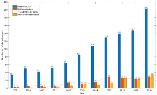 The number of published papers per year from 2008 to 2018. The bars and their above numbers depict the number of published papers in the according year. The blue bars represent the topic of mobile LiDAR, the red ones represent the topic of MLS and urban, and the yellow ones represent the topic of MLS and classification. The red curved line is the trend fitting of MLS and urban topic by spline data interpolation.