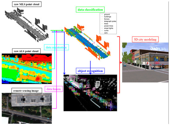 For the applications described in Section 3, many key technologies of MLS data processing and analysis are involved (Figure 4). First, the raw MLS point cloud often needs to be classified to identify the class for each point. Second, individual objects can be identified from MLS raw or classified point clouds. Third, MLS data are often fused with other data sources such as ALS point clouds and optical imagery to improve the classification and detection accuracy. Therefore, the registration of MLS with ALS point clouds and/or imagery is important. Finally, the detected and classified objects from MLS point cloud can be used for 3D city modeling.