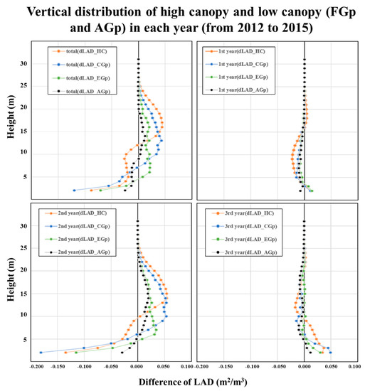 We also concluded that the leaf area index showed consistent values year by year, while the leaf area profile (e.g., leaf area density) showed inconsistent yearly changes in both high and low canopies. Among the low canopies, we could conclude that they were vulnerable to physical damage, particularly in AGps. In the case of FGps, they also drove the growth and disturbance aspects of forest dynamics and served to diversify the canopy structure; most of them were closing in a lateral direction by gap-edge trees. Furthermore, high canopies expanded their foliage at a higher height (12 m) than those of low canopies (5 m).