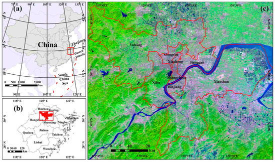 Location of the study area. (a) Location of Zhejiang province in China. (b) Location of Hangzhou Metropolitan Area (HMA) in Zhejiang province. (c) Overview of the HMA in a Landsat image taken in 2015 with a false colour composite.