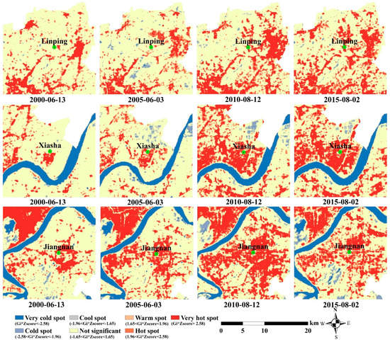 Moreover, we analysed the spatial pattern of the SUHI in the three satellite towns of Linping, Xiasha and Jiangnan. The first row of Figure 4 illustrates the SUHI evolution of Linping town. The concentrated hot and very hot spot areas moved to the outskirts during the study period. Linping town is a traffic hub in the HMA, and the agglomeration of population, industry and transportation infrastructure significantly changed its thermal environment. The second row of Figure 4 shows the SUHI evolution of Xiasha town. The rapid aggregation of college students, high-quality talents and skilled workers caused some areas to change from insignificant and warm spots to hot and very hot spots. The third row of Figure 4 shows the SUHI evolution of Jiangnan town, which indicated a similar change trend as that of Linping and Xiasha during 2000–2010. However, the Binjiang High-tech Development Zone in the town attracted a large number of relatively light industries during 2010–2015 and a number of high-tech enterprises are distributed in well-planned neighbourhoods. These results indicate that the SUHI effect was alleviated in 2015 relative to 2010. Moreover, Figure 5 shows the SUHI evolution of several key town groups in the HMA during 2000–2015. The Liangzhu, Yipeng, Guali and Yuhang town groups in the HMA have an increasingly severe SUHI along with their rapid urbanization process. The town groups of Linpu and Pingjiao are located in the fringe of the study area and have relatively high elevation and abundant vegetation coverage, and urban development has little effect on these regions. Consequently, their cold and very cold spot areas show an increased trend.