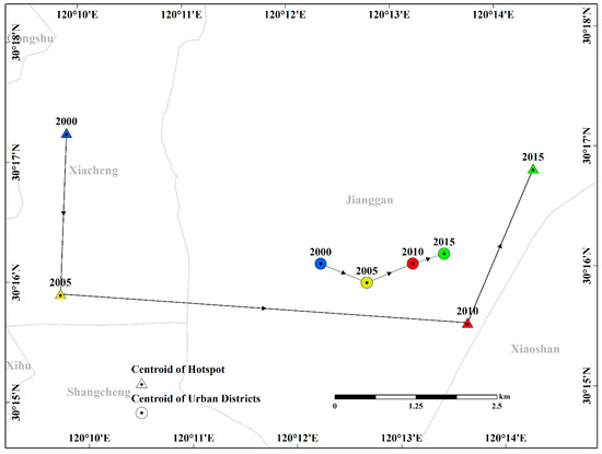 Furthermore, Figure 6 shows the centroid trajectories of hot and very hot spot areas and the urban area in HMA during 2000–2015. The centroid of hot and very hot spot areas was in the left of the urban centroid in 2000 and moved eastwards and northwards in 2005 and 2010, respectively. The centroid of hot and very hot spot areas moved eastwards during the entire study period, coinciding with the moving direction of the urban centroid. The movement of the urban centroid was related to the development strategies implemented in the HMA: “Moving from the West Lake Times towards Qiantang River Times.” The economy and society in the east of the HMA and the south bank of the Qiantang River have achieved higher growth rates. To the south is Binjiang District, where a state-level economic and technological development zone is located. To the east is Jianggan District, where Xiasha university town and Jiubao industrial park are located. The rapid development in these areas resulted in more high-LST clusters, making the centroid of the hot spots move eastwards in general.