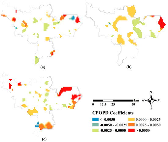 Spatial variations in significant local parameter estimates for the relationship between CPOPD and CSUHII: (a) 2000–2005; (b) 2005–2010; (c) 2010–2015.
