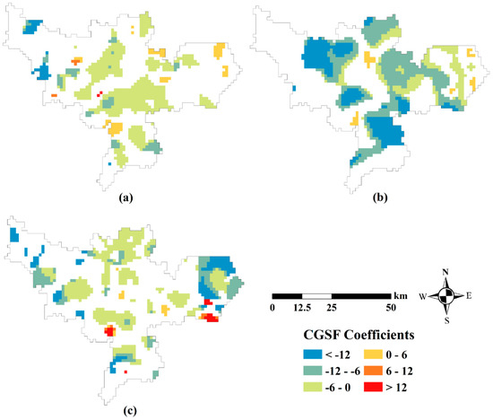 Spatial variations in significant local parameter estimates for the relationship between CGSF and CSUHII: (a) 2000–2005; (b) 2005–2010; (c) 2010–2015.