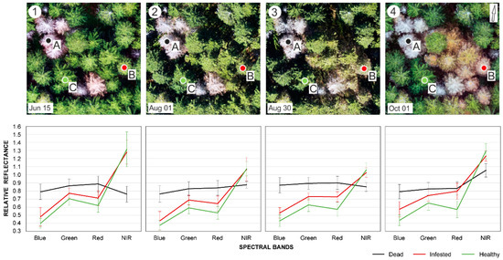 The spectral response of identified trees varied across the dates of acquisition (Figure 2). The imagery analysis was used to determine spectral profiles of the healthy, dead, and infested trees throughout the season. The spectral differences between healthy and infested trees were distinguishable both in the visible and near-infrared bands and kept increasing with later dates of acquisition. The spectral differences between the infested and healthy trees were higher in the visible bands than in the near-infrared bands.