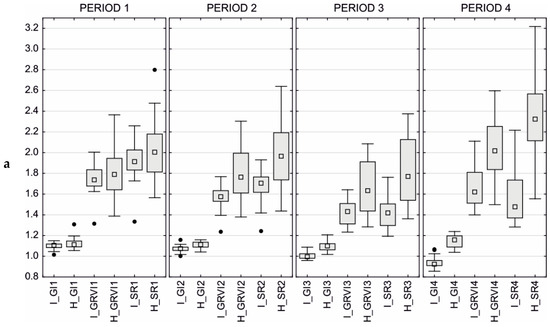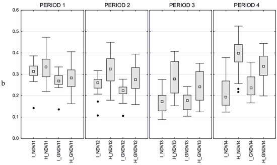 (a) Box-plots displaying quartile characteristics (median, Q25, Q75) for SR, GI, and GRVI, respectively (always in the order I-sample—infested, H-sample—healthy), in the four sensing periods. Black dots represent outliers; (b) Box-plots displaying quartile characteristics (median, Q25, Q75) for NDVI and GNDVI, respectively (always in the order I-sample—infested, H-sample—healthy), in the four sensing periods. Black dots represent outliers.