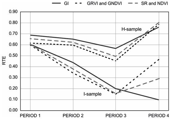 Relative Treatment Effect (RTE) values (GI: solid curves, GRVI and GNDVI: dotted curves, SR and NDVI: dashed curves; H-sample—upper curves, I-sample—lower curves).