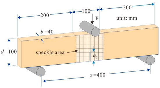 A 3-p-b flexural test on SEN beams was adopted to measure the mode-I fracture crack propagation in the L direction. The specimen geometry b × d × l (width × depth × length) = 40 mm × 100 mm × 500 mm with a span s of 400 mm is shown in Figure 1. The span-to-depth ratio was determined as s/d=4. Due to the size limit of sawn lumber, the specimen was symmetrically composed of three parts, for which the longitudinal direction was all oriented along the loading direction. The three parts were bonded together with epoxy adhesive. The initial notch was cut with a band saw of 2 mm thick, while the notch tip was prolonged with a razor blade with a thickness of 0.5 mm. Four groups of beams with different initial crack lengths a0 were prepared with three specimens for each group, as the initial crack length a0 was determined as 30, 40, 50 and 60 mm, in that the notch-to-depth ratio, a0/d, was 0.3, 0.4, 0.5 and 0.6. There were three specimens in each a0/d group, and each specimen was numbered as (a0/d)–n, e.g., specimen 0.3-1 is associated with the first specimen in the notch-to-depth ratio group, a0/d = 0.3.