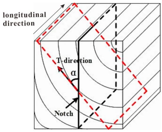 As a result of the wood grain texture, the notch plane did not coincide with the TL or the RL system perfectly. As shown in Figure 2, there was an angle α between the notch plane and the L-T plane. Specimens with a value of α around 70° were prepared to exclude the effect of angle pattern on the fracture performance.