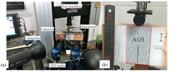 The 3-p-b test was carried out by a 10 kN electro-mechanical testing machine. The load P was applied along the grain direction, in the same plane of the pre-notch. Displacement control with a rate of 1 mm/min was adopted in order to reach the peak load Pmax in about 2 min to minimize possible viscoelastic effect. Two clip gauges with the measuring range of ± 2 mm were fixed on the side surface by knife edges to measure the crack mouth opening displacement (CMOD) and crack tip opening displacement (CTOD). Two cameras were placed one meter in front of the specimen to capture images continuously, and two high-power LED lights were placed next to the camera to provide sufficient light source, as shown in Figure 3a. The digital cameras had a resolution of 2310 × 1720 pixels and gave 256 levels of gray output. For this resolution, one pixel in the image represented approximately 69 μm on the specimen. The computation resolution of the DIC program was 0.01 pixels, so the measurement resolution was in the order of 0.69 μm, which was sufficient to determine the displacement measurement. The shooting frequencies of the two cameras were different: one was used to capture the whole fracture process with a shooting frequency of 20 pictures per second, and another was used to capture the propagation of the crack with a shooting frequency of 200 pictures per second. Data from the two cameras were synchronized over time, and then the Correlated Solutions software [22] was used to perform the DIC technique.