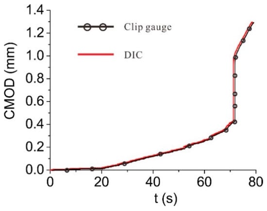 The DIC technique can be used to determine the CMOD by the relative displacement of two points on both sides of the crack tip [14,19]. To verify the DIC analysis, the measured CMOD values from the DIC technique and the clip gauge were compared with each other. Taking Specimen 0.3-3 as an example, the CMOD measured by these two methods agree well with each other, as illustrated in Figure 4, indicating that the DIC technique used here is suitable to accurately measure the displacement field of the crack propagation.