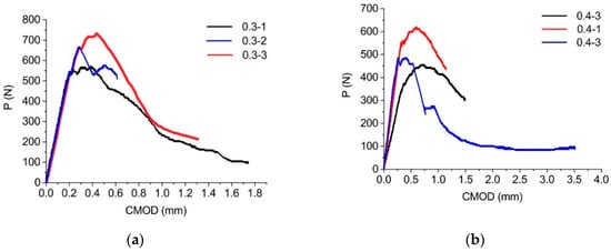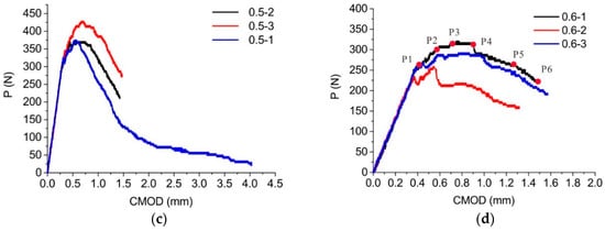 The experimental curves P-CMOD of the four group specimens. (a) a0/d = 0.3, (b) a0/d = 0.4, (c) a0/d = 0.5, (d) a0/d = 0.6.