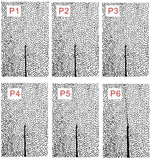 Take specimen 0.3-3 as an example. As is shown in Figure 6, the P-CMOD curve is divided into three stages: linear stage, softening stage, and failure stage, which are consistent with the crack development: crack formation, crack growth, and crack propagation, respectively. Six typical points, P1-P6, are selected from the 0.3-3 test curve. The speckle images of the failed specimen (area of 70 mm × 30 mm) at these loading points are shown in Figure 7. Although 267 images were obtained every second, it is difficult to see the difference of the crack between the first five images by human vision, before the crack propagates unsteadily. However, the corresponding horizontal strain fields obtained from DIC technique captured the entire progression of the crack tip (Figure 8).