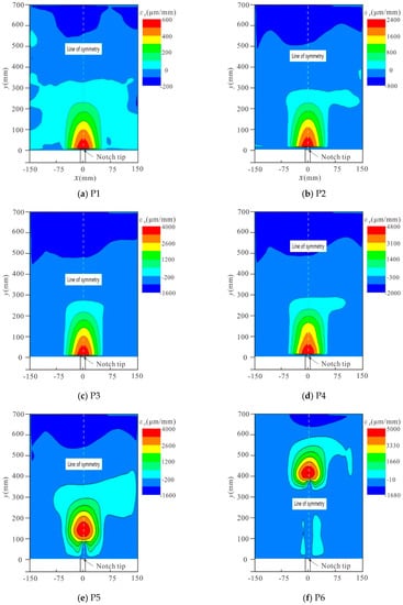 Horizontal strain contours of specimen 0.3-3 at different load points: (a) P1; (b) P2; (c) P3; (d) P4; (e) P5; (f) P6.