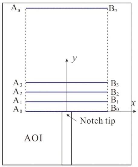 Since the DIC technique can obtain the full field of specimen deformation, it can be used to determine the fracture process zone (FPZ) in accordance with the crack propagation. An analysis region with a width of 30 mm in front of the preformed crack was selected for analysis, as shown in the red box in Figure 9. First, a lateral line A0B0 is set in the x direction (perpendicular to the symmetry line) at the initial crack tip, and then a series of parallel lines, A1B1, A2B2,..., AnBn, are marked with an interval of 2 mm. The horizontal displacement u of each straight line along the x direction (indicating crack opening) and the vertical displacement v along the y direction (indicating crack sliding) are obtained by comparing the continuous speckle pictures. Then, the profile of the crack and the FPZ size at each loading point can be determined [14,18].