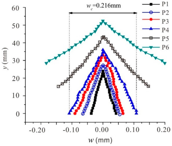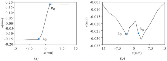 Take the specimen 0.3-3 as an example. Figure 10 represents the displacement of A0B0 along the x and y directions at loading point P5 (Figure 5a). Point L0 and R0 in Figure 10 represent the two boundary points at the jump of transverse displacement. The distance between L0 and R0 in Figure 10a is 0.335 mm, which represents the opening displacement of the crack on line A0B0. The sliding displacement at points L0 and R0 in Figure 10b are –0.0276 mm and 0.02684, respectively. So, the sliding displacement along the crack is much smaller than the transverse displacement, which agrees well with the properties of Mode I fracture [29]. In this way, the opening displacement and sliding displacement on A1B1, A2B2,..., and AnBn can be calculated, and the position of the crack tip can be obtained when the displacement of the inspected line reaches zero. With this method, the crack profile at the characteristic point of specimen 0.3-3 and specimen 0.6-1 are determined, as shown in Figure 11.