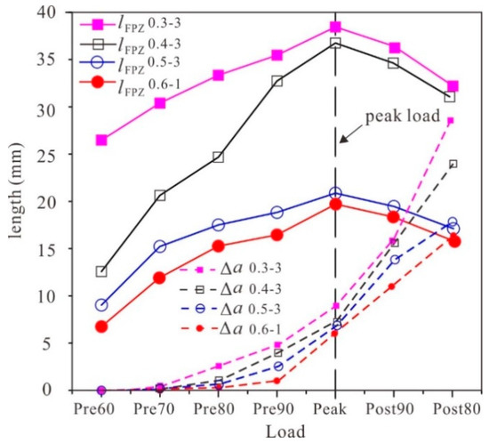 The crack increment, Δa = aeq − a0, is plotted in Figure 12. It is shown that the specimen with smaller a0/d has a larger Δa, and thus dissipates more fracture energy, which agrees well with the FPZ evolution. Taking the specimen 0.3-3 as an example, the developments of FPZ and aeq are compared in Figure 13. It can be seen that FPZ propagates at the beginning of loading, while the aeq begins around ‘Pre60~Pre70’. Moreover, FPZ decreases after the peak load while aeq develops longer and faster in this stage.