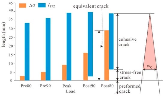 During the fracture process, FPZ evolution is mainly divided into two stages: first, with increasing applied load, the FPZ size increases until the crack opening displacement (COD) reaches its maximum value, wc. Complete FPZ is formed at this time, and the length of the FPZ reaches the limit value. In the second stage, as the COD increases, the FPZ moves forward toward the loading point. According to the cohesive fracture model, it can be considered that the crack surface cannot transfer the tensile stress anymore, and a stress-free crack is formed when the COD is bigger than wc, Therefore, the length of the FPZ can be determined by the distance between the stress-free crack tip and the point where the normal stress reaches the ultimate tensile strength [9,30].