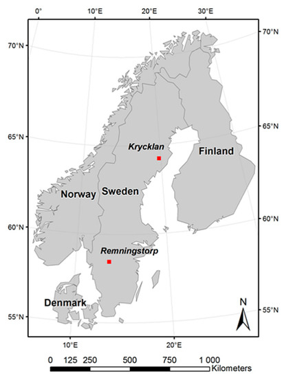 Map of Sweden showing the location of the test sites of Remningstorp and Krycklan.