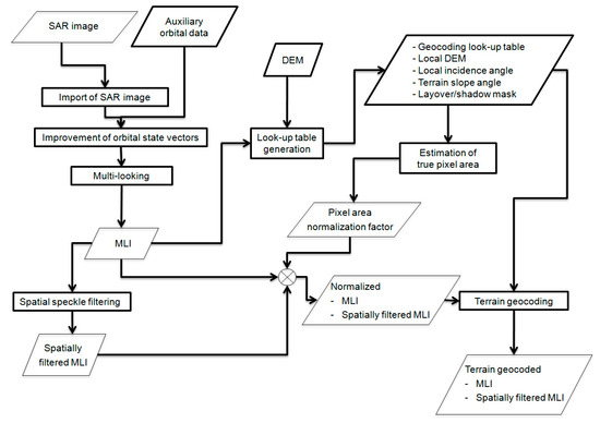 Flowchart of processing for a SAR image. DEM: Digital Elevation Model. MLI: Multi-looked Intensity.