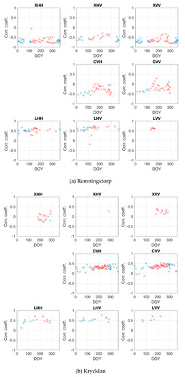 Correlation coefficient of SAR backscatter and stem volume as a function of day-of-year, (DOY) at Remningstorp for 48 inventory plots (a) and Krycklan for 325 inventory plots (b). Colors refer to the minimum temperature on the day of image acquisition. Crosses are blue or red depending whether the temperature was below or above 3 °C.