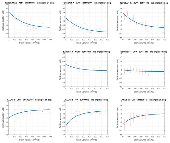 The overall behavior of the relationship between SAR backscatter and stem volume in time is summarized in Table 4 and Table 5 in the form of trend indicator, dynamic range and relative root mean square error (RMSE). These parameters were derived after fitting Equation (3) for each frequency band and polarization using all samples in the reference dataset as training set. The trend indicates whether the modeled backscatter increased or decreased for increasing stem volume, i.e., σ0gr < σ0veg or σ0gr > σ0veg. The dynamic range represents the difference σ0veg − σ0gr (in absolute terms) thus being a measure of the sensitivity of the backscatter to stem volume. The relative RMSE represents the retrieval error for estimates of stem volume using Equation (7). It is remarked that the relative RMSE in Table 4 was computed using the same samples used for model training, thus not being a measure for the actual retrieval error of the methods here presented. For each frequency band and polarization, we illustrate the individual estimates of σ0gr and σ0veg together with measurements of temperature, precipitation and snow depth, as well as a measure of the stem volume retrieval error for each SAR backscatter image in the supplement.