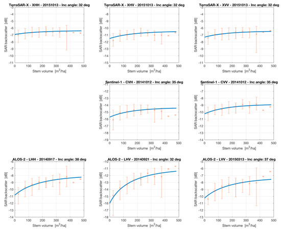 Particular care was taken in case a backscatter measurement is not within the range of σ0gr and σ0veg [33]. For backscatter observations, σ0for, smaller than the estimate of σ0gr in case the model predicts an increase of backscatter with increasing stem volume or larger than σ0gr in case the model predicts a decrease of backscatter, a stem volume of 0 m3/ha was assumed. For backscatter observations, σ0for, larger than the estimate of σ0veg in case the model predicts an increase of backscatter with increasing stem volume or smaller than σ0veg in case the model predicts a decrease of backscatter, a stem volume equal to the maximum stem volume was assumed.