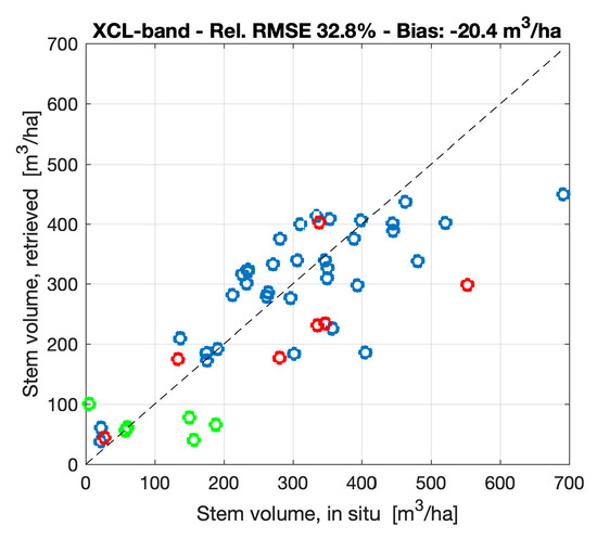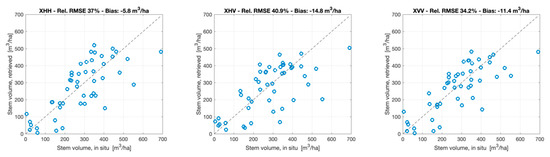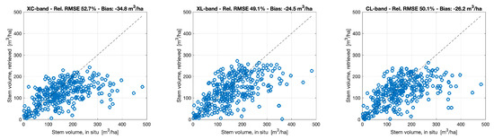 Figure 7 and Figure 8 show the scatter plots of in situ and retrieved stem volume at Remningstorp in the case of MT retrievals for a given frequency band and polarization and MTP retrievals for a given frequency band, respectively. For CHH, the number of observations was insufficient to create a multi-temporal combination.