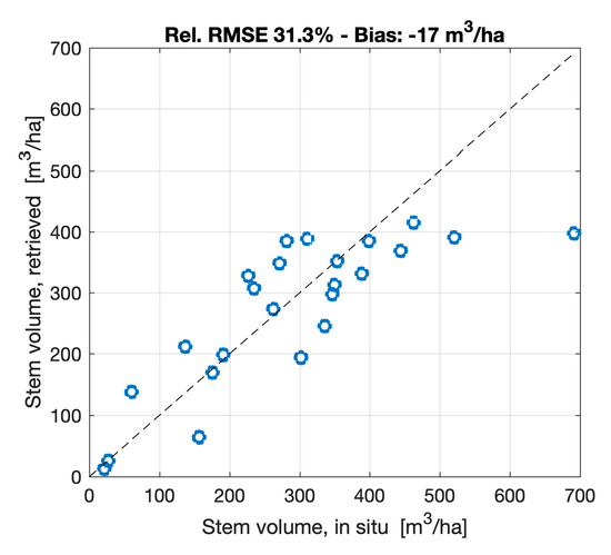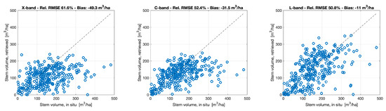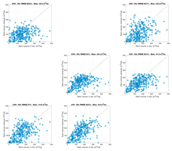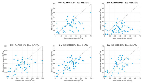 Figure 7, Figure 8, Figure 9 and Figure 10 show in situ and estimated stem volumes for each of these combinations. On top of each panel, the relative RMSE and the estimation bias are reported. As for the results illustrated in Table 4 and Table 5 and Figures S1–S12, the test set coincided with the training set, i.e., the WCM was trained with all samples and inverted using the same samples. Since the aim of this analysis was to identify strengths and weaknesses of different types of combinations, we preferred maximizing the number of samples used to train and test the method bearing in mind that the retrieval statistics should not be interpreted as an absolute measure of the retrieval accuracy. This aspect is dealt with in Section 5.4 when the method here proposed is trained and tested with two independent datasets.