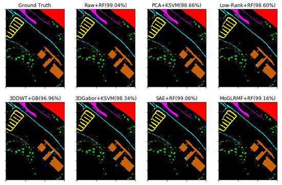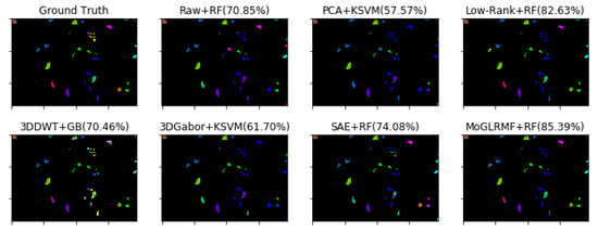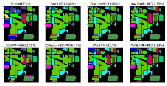 From Table 5, we can observe that, with the number of training samples increasing, the classification accuracy keeps increasing, which is a reasonable result since more training samples can help train better classifiers. From Table 5, it can also be seen that the proposed MoGLRMF feature with RF classifier performs best in all the cases. For example, in the case of a 1% proportion on the Kennedy Space Center dataset, the MoGLRMF method achieves 86.59% OA, while the second best only obtains 84.67% OA. In addition, these results can also be used as baseline results for further research. In addition, we report the average cost time for each method in Table 5. From Table 5, it can be easily observed that, although we have utilized parallel strategy, the proposed method is the most time-consuming, which is attributed to the processing of a large number of local patches. Finally, to provide a better visualization for these results, we also show some classification maps (All the classification maps are the result of the 1st experiment in the 20 experiments) from Figure 3, Figure 4 and Figure 5 by utilizing the SHIP. From the classification maps, it can also be easily seen that the MoGLRMF method can obtain more accurate and smooth classification maps compared with other competing methods.