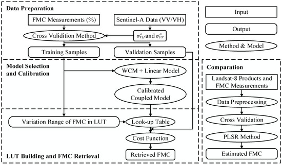 In this study, the empirical bare soil backscatter linear model and the semi-empirical vegetation backscatter WCM were coupled to link the observed backscatter from the dual-polarimetric Sentinel-1A data directly to forest FMC. The performance of the presented method was adequately verified using the three-fold cross-validation method. In addition, to further test the performance of the presented Sentinel-1A data-based method for forest FMC estimation, our results were compared to those obtained using the Landsat 8 OLI data and the PLSR method. A flowchart of the presented method for forest FMC estimation from dual polarimetric Sentinel-1A data is given in Figure 1.