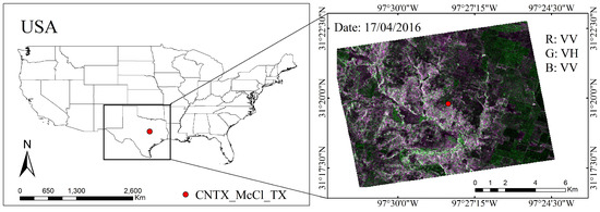 Since the Sentinel-1A data in the USA was only available after 2016, and to reduce the effect of local radar incidence angle, only the FMC measurements sampled in CNTX_McCl_TX site (31°19’48’’N, 97°28’12’’W, with 21 measurements taken in Texas, shown in Figure 2) were selected to verify the performance of the methodology presented in this study. The selected site has a greater number of forest FMC measurements and available Sentinel-1A images compared with the other sites included in this database. The FMC data were measured every 30 days from May 2016 to January, 2018 (see Appendix A, Table A1). The vegetation species in this site are heterogeneous and mixed with Bluestem, Juniper, Redberry and Oak. The sampling area is about 5 acres, and the sampling plots were relatively homogeneous distributed in terms of species composition, canopy cover, aspect, and slope steepness. About 5 to 15 samples per species within the site were collected and weighed immediately, then dried at least 24 h at 100°C in the laboratory and then weighed again. The average FMC of all sampled species was used to characterize the FMC level of the sampling site. For a more detailed description of FMC sampling protocols, please refers to the Fuel Moisture Sampling Guide provided by NFMD (https://www.wfas.n/nfmd/references/fmg.pdf).