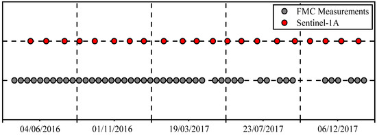 Overview of the temporal coverage of acquired 46 Sentinel-1A data and 21 field forest FMC data.