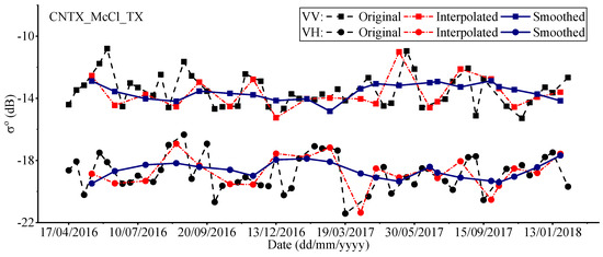 The times-series Sentinel-1A data in its original, interpolated and smoothed versions.
