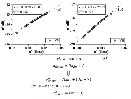 Linear relationship between backscatter in dB unit and that in linear unit over a small variation range for VV (a) and VH (b) polarization mode, and corresponding conversion formulas (c) used to reduce the model complexity.