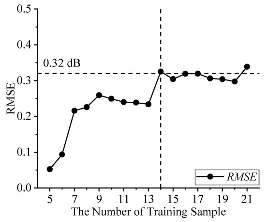 RMSE (dB) between modelled and measured VH backscatters corresponding to different numbers in the training sample.