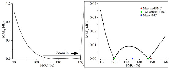 However, the LUT inversion method is generally hampered by the ill-posed inversion problem, meaning that different input parameter combinations (i.e., FMC and VV backscatter) may correspond to almost identical output (i.e., VH backscatter), and would dramatically decrease the accuracy level of retrieved parameters (i.e., forest FMC) [11,68]. For instance, Figure 7 shows an example of the ill-posed inversion problem where two minimum FMC values (green points with 121 % and 147 %) can be obtained with the lowest MAEr between the modelled and measured VH backscatters. The ground measured FMC is 149 % (red point), which is closer to the green dot on the right (FMC = 147 %), than the green dot on the left (FMC = 121 %) and the mean of both green dots (blue point, FMC = 134 %). This phenomenon seriously raises the question about how to choose the final solution to the inversion from these solutions.
