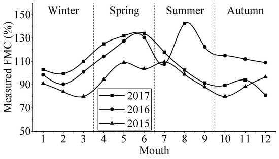 Previous studies showed that the use of prior knowledge (such as the ranges of free parameters and their distributions from field measurements or remote sensing products, and the vegetation canopy type structure) is an efficient way to alleviate the ill-posed inversion problem [68]. In this study, we found that the time-series FMC measurements of this study site in 2015, 2016 and 2017 showed a strongly seasonal phenological feature of high and low FMC values among different periods (Figure 8). Thus, this feature was introduced into the retrieval procedure to alleviate the ill-posed inversion problem: for the high-FMC periods (spring and summer), the higher FMC value corresponding the lowest MAEr was selected as the optimal retrieved FMC, and for the low-FMC period (autumn and winter), the lower FMC value corresponding the lowest MAEr was selected as the optimal retrieved FMC.