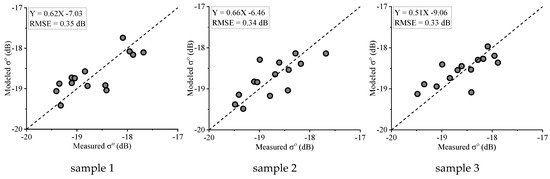 In addition, from the perspective of statistical analysis, an insufficient number in the training sample may result in an overfitting problem when using the non-linear least square method, which may lead to poor predictions [23]. Therefore, to determine the optimal number for the training sample and avoid the overfitting problem, different number of training sample were selected to calibrate the coupled model, and the RMSE between the modelled and measured VH backscatters was selected to evaluate the performance of the model calibration. As is showed in Figure 6, the RMSE showed an upward trend with an increased number in the training sample up to 14; then the RMSE of the model calibration stabilized around 0.32 dB, indicating that the overfitting problem was alleviated. Consequently, a three-fold cross-validation method was presented to fit Equation (10) and validation of retrieved FMC by dividing all the measurements taken at the study site into equally three samples (i.e., each sample comprised 7 FMC measurements). Two samples (i.e., the training sample) were used for the model calibration (Equation (10)), and the other sample (i.e., the testing sample) was used for the validation. The process was repeated for three times to adequately test the performance of the presented Sentinel-1A data-based method.