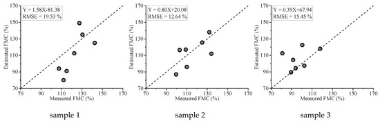 Compared with the forest FMC estimated results using the presented Sentinel-1A data-based method (Figure 9 and Figure 10), FMC was poorly estimated using the Landsat 8 OLI data and the PLSR method, with the RMSE between estimated and measured forest FMC being 20.11% (Sample 1), 26.21% (Sample 2) and 26.73% (Sample 3). Figure 13 shows the time-series distribution of estimated and measured forest FMC. It was found that the time-series trend of estimated forest FMC was not well fitted along with the measured one when compared with Figure 11.