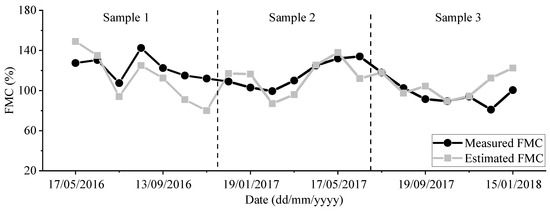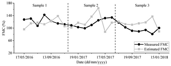 Figure 9 shows the scatterplots between modelled and measured VH backscatters using the three-fold cross-validation method. It can be found that the VH backscatter of training sample was correctly modelled by the presented coupled model as illustrated by a low RMSE value when compared to the measured VH backscatter (0.33 dB (sample 1), 0.34 dB (sample 2) and 0.35 dB (sample 3)), indicating that the calibrated coupled model (Equation 10) can well simulate the backscatter situation of surface. A LUT was then generated by running the model forwardly, and the observed VH backscatter of the testing sample was used to retrieve forest FMC. Figure 10 shows the scatterplots between estimated and measured forest FMC using the three-fold cross-validation method. Overall, it can be concluded that the forest FMC measurements at the study site were accurately estimated, with RMSE between measured and estimated forest FMC of 19.53% (Sample 1), 12.64% (Sample 2) and 15.45% (Sample 3). Figure 11 shows the time-series distribution of estimated and measured forest FMC of the study site. Although the estimated FMC may be higher or lower than the measured forest FMC, the time-series trend of measured forest FMC is reproduced well by the estimated FMC.