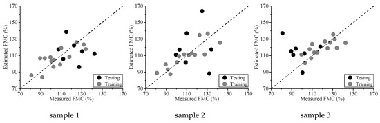 As a comparison, the Landsat 8 OLI data was also used to retrieve forest FMC using the PLSR method in the study site. Figure 12 shows the scatterplots between estimated and measured forest FMC using the three-fold cross-validation method, and Table 1 lists the corresponding RMSE of PLSR model training and testing. From Figure 12 and Table 1, it is obvious that although the accuracy level of PLSR model training is satisfactory (RMSE of three training samples are less than 10% and the corresponding scatterplots are distributed around the 1:1 line), the estimated results using the testing sample were not acceptable with a higher RMSE (approximately 24%) and the seriously deviated scatterplots with regard to the 1:1 line.