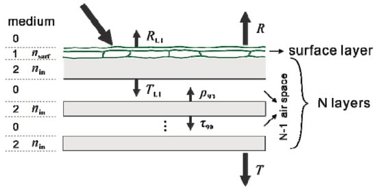 where . The reflectance ρ90 and transmittance τ90 of the other N-1 elementary layer follow Equations (1) to (6) in [18]. The total reflectance (R) and transmittance (T) of a leaf is calculated by stacking the first layer group (a plate coated with surface layer) and the N-1 layers according to [18].
