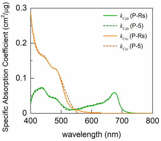 Specific absorption coefficients (SAC) of total chlorophyll (kCab, green lines) and carotenoids (kCxc, orange lines). The solid lines are from PROSPECT-Rsurf (P-Rs), and the dashed lines from PROSPECT-5 (P-5).