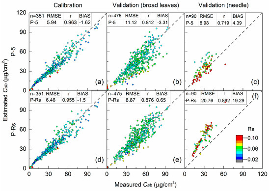 Estimation of chlorophyll content (Cab) by inverting PROSPECT-5 (P-5) (a–c), and PROSPECT-Rsurf (P-Rs), (d–f) for calibration (the left column), broad leaves in validation datasets (the middle column) and needle leaves in validation datasets (the right column). The color of the points corresponds to the reflectance of the surface layer (Rs). The units of root mean square error (RMSE) and bias (BIAS) are µg/cm2. All the correlations are significant at 0.01 level.