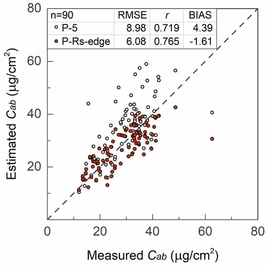 In order to further investigate the ability of the improved model for estimating needle chlorophyll content, we incorporated the edge effects of needles using the methods proposed in [33] in the modified model PROSPECT-Rsurf. According to [33], needle width and thickness, were introduced into the model to take into account the effects of leaf morphology on Cab retrieval. The performance of Cab estimation was improved by considering the edge effects in PROSPECT-Rsurf (P-Rs-edge), as demonstrated in Figure 4. The overestimation of Cab is alleviated compared to PROSPECT-Rsurf in Figure 3f. The RMSE using P-Rs-edge decreases from 8.98 to 6.08 µg/cm2, with r increasing from 0.72 to 0.77, and BIAS adjusted from 4.39 to −1.61, compared to that of PROSPECT (P-5). Cab estimated using P-Rs-edge is also better than the results of incorporating the edge effects without considering the variation of leaf surface reflectance demonstrated in [33] (RMSE = 6.32 µg/cm2, r = 0.77), with the scattered points closer to the 1:1 line.